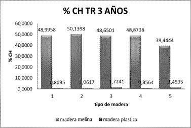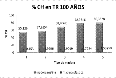 Se aprecia que el %CH de la madera natural para un tiempo de retorno de 100 años es mucho mas elevado que el %CH de madera plastica, el %CH maximo hallado es de 80,3528% lo que resulta lógico, sabiendo que la madera natural, en este caso la melina puede llegar a un %CH de hasta el 120% de acuerdo a lo estipulado en la Norma Técnica Colombiana NTC 3545 [14].