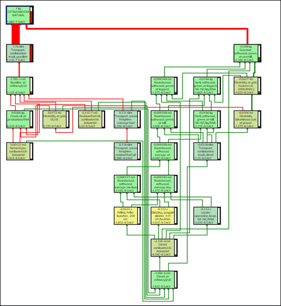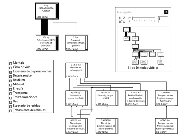 El análisis del inventario del ciclo de vida comparativo (ICV) para la estiba de madera natural elaborado en SIMAPRO 8.4.0 [10] fue el siguiente: