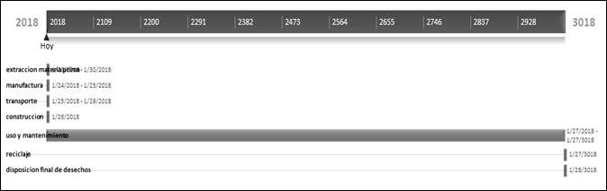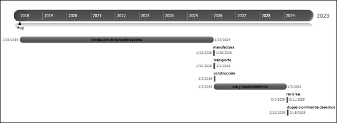 De acuerdo con la Norma Técnica ISO-1133 [12] para la estiba de madera natural, el mayor tiempo durante su ciclo de vida es ocupado por la fase de extracción de materia prima, ya que, la madera melina debe crecer y desarrollarse durante mínimo 8 años para su primera poda, la segunda fase con más tiempo es la de uso y mantenimiento, la cual tarda 2 años, este cálculo es brindado por aserraderos oficiales quienes aseguran dicho tiempo para una estiba excelentemente cuidada. El mantenimiento en las estibas es casi nulo. Las otras fases no demoran más de 1 semana ya que tratan cosas simples y rápidas, como ensamblaje, transporte y disposición de desechos [15].
