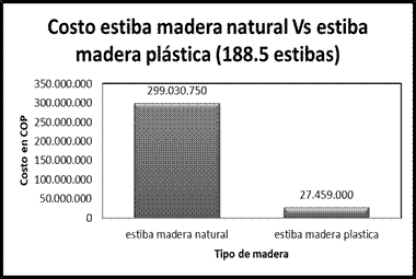 Los costos entre los dos tipos de maderas analizados arrojaron valores económicos diferentes, tal como se muestra en la fig. 20 la cual indica que el costo de producción de la unidad funcional en madera natural tiene un costo de $299.030,750 pesos colombianos para el año actual y en madera plástica, un costo de $27.459.000 pesos colombianos.
