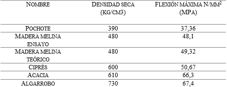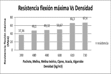 La resistencia a la flexión de la madera es proporcional a su densidad, para confirmar esta afirmación, se compararon las resistencias de 5 especies más de madera natural, los valores encontrados fueron: