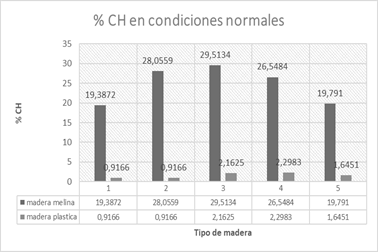 Se aprecia el notorio porcentaje de contenido de agua en las muestras de madera natural, llegando a un porcentaje promedio de 24,65918% y la madera plástica solo retiene un 1,58782%, lo que demuestra que para condiciones normales las estibas de madera natural no cumplirían con el propósito de almacenamiento adecuado de alimentos y sus propiedades mecánicas ya se habrían reducido moderadamente debido a que su %CH supera el estado muy seco.