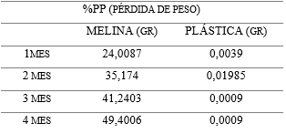 La madera natural en 4.00 meses perdió casi la mitad de su peso y masa por ataque de termitas, y la madera plástica escasamente perdió un 0.01985% debido a factores ambientales encontrados en el medio, se descarta que haya sido por ataque de termitas debido a que la dieta de dichos insectos sociales es a base de celulosa, y la madera plástica al estar hecha de 100% polietileno la hace inmune a este tipo de ataques, muy al contrario de la madera natural que se compone de un 40% - 50% de celulosa.