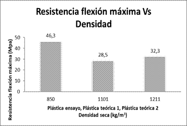 Esto nos confirma que la resistencia a la flexión de la madera melina, con respecto a su densidad, es muy buena. Se analizó lo mismo con la madera plástica, los resultados fueron: