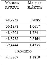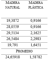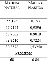 Lo anterior, se registra de acuerdo con lo contrastado en la Norma Técnica ASTM D-1238 [16]. Se corrobora la gran ventaja de la madera plástica frente a la natural en cuanto a todos los organismos xilófagos, ya que todos estos solo consumen la celulosa presente solo en la madera natural.