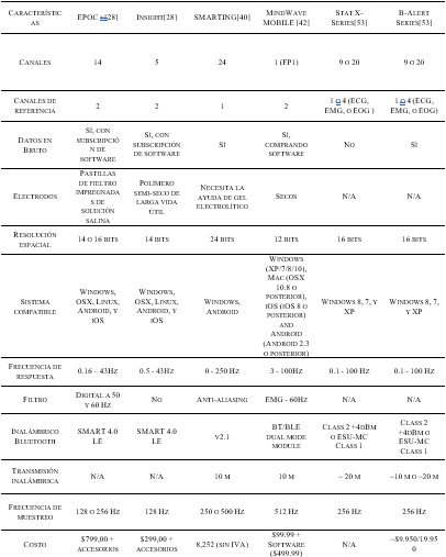 La tecnología de consumo actualmente disponible en el mercado incluye auriculares o cascos portátiles diseñados principalmente para aplicaciones interfaz cerebro-computador (Brain Computer Interface o BCI) como, por ejemplo, Emotiv (EPOC+ e Insight), Neurosky (MindWave), etc [19], [20], [24]. También existen dispositivos más pequeños, diseñados principalmente para usar en aplicaciones de monitorización psicofisiológica y de neurofeedback, como ejemplo B-Alert-X series, mBrainTrain (SMARTING), etc. [20], [24].