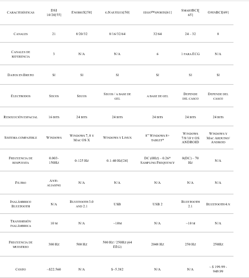Por último, se complementó la información de cada equipo con la que cada empresa fabricante del equipo aportaba en su página principal, es decir, artículos donde probaron el equipo para EEG, información de fabricación o de características del equipo, etc.