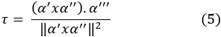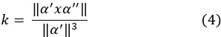 Además, si α(t) es una curva regular parametrizada y sean α'(t), α''(t), α'''(t) las derivadas primera, segunda y tercera, respectivamente, de la curva α, se puede definir las funciones curvatura y torsor, según las ecuaciones 4 y 5, los cuales se interpretan como el cambio de dirección del vector tangente para la curvatura, y el cambio de dirección del vector binormal para la torsor.