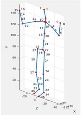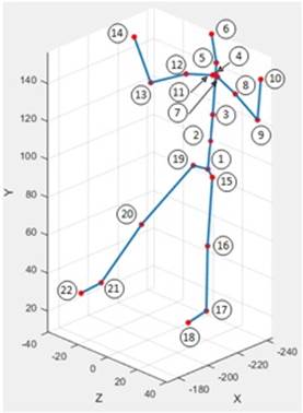 Para determinar las variables proporcionadas por el marco de Frenet – Serret se toman los datos de las posiciones X, Y, y Z de cada uno de los marcadores presentes en los sujetos, tanto para Kinect como Vicon, según se muestra en las Figuras 1 y 2. Como se puede evidenciar estas dos tecnologías tienen un número diferente de marcadores, lo que exige que su posición dentro del sujeto sea diferente, evitando que estas dos tecnologías sean comparadas directamente. Además, la ubicación de las coordenadas cartesianas en la tecnología Vicon tiene un punto fijo de referencia externo al sujeto, y la del Kinect es móvil, ya que su referencia es respecto al marcador uno, el cual está ubicado al nivel de la cintura, como se muestra en la Figura 1.