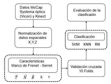 Dentro de los métodos tradicionales en el reconocimiento de patrones para el movimiento, se tienen dos elementos importantes que son la caracterización de los datos y su clasificación, en donde para el primer procedimiento se busca identificar una variable o rasgo común dentro del grupo de datos, y para el segundo se toma dicha variable y se genera una clasificación. Encontrando en la literatura una gran cantidad de trabajos en donde por ejemplo se enfocan en determinar la posición de un sujeto, por medio de plantear relaciones geométricas entre segmentos corporales [4][5][6][7] o la construcción de histogramas con las posiciones espaciales de los marcadores [8]. Así mismo, se han empleado enfoques dinámicos [9][10][11], en donde se incluyen características del movimiento como la velocidad, aceleración y posición del cuerpo.