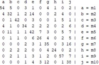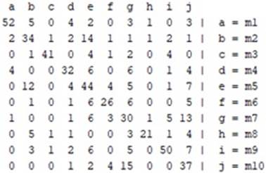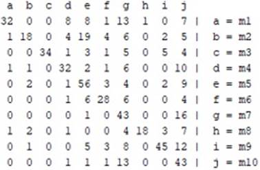 Basado en los resultados de clasificación de las dinámicas o movimientos, mostrados en la Tabla 1. Se determinó que al momento de realizar las comparaciones entre los diez movimientos se logra una clasificación del 100 % con cada uno de los algoritmos en los datos Vicon, los que no se logra con los datos del Kinect, como se muestra en las matrices de confusión, Figuras 4,5 y 6; sin embargo, si se toma los resultados de comparar los movimientos de forma individual se tiene movimientos que llegan al 99% de éxito en la clasificación, como el obtenido entre los movimientos de paso adelante (m3) y extensión de hombro (m8), disminuyendo en el porcentaje hasta el 67%, presentado entre los movimientos abducción de hombro (m7) y levantar brazo derecho (m10), observando que la mayoría de los movimientos presentaron porcentajes de alrededor del 90%.