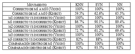 Igualmente, se presenta en la Tabla 1, los resultados de la comparación entre los movimientos bien y mal ejecutados, encontrando porcentajes que varían entre el 70% y el 90% de clasificación para los movimientos, sentadilla profunda (m1), sobrepaso de obstáculo (m2), paso adelante(m3) para datos tomados con el Kinect, para los datos Vicon se tiene la tendencia de un 100% en la clasificación. Y por último se tiene los resultados un conjunto de ciclos de movimientos similares, con un 100% de éxito para Vicon y 92% para el Kinect.