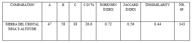 In the floristic comparation between Terminalio aroldoi - Tabebuietum dubiae (Sierra del Cristal) and Buxo rotundifoliae-Calophylletum utilis (Moa’s altitude); values contrast (0.44 dissimilarity), at the same time both reach a high common species percentaje (c) (Table 3).