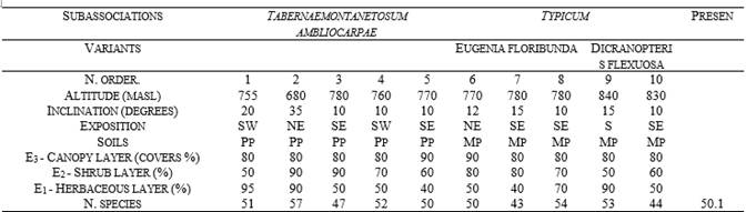 Two variants are found Eugenia floribunda and Dicranopteris flexuosa. The first is observed in places where environmental moisture is big with a differential combination compound by Eugenia floribunda (Willd.) O. Berg, Homolepis glutinosa (Sw.) Zuloaga & Soderstr. and Tolumnia sp. Second is present in the greater heigh of the association and is defined by Machaerina filifolia Griseb., Dicranopteris flexuosa (Schrad.) Underw. and Byrsonima sp. and are absent Jacaranda arborea Urb., Platygyna hexandra e Ilex nitida (Vahl) Maxim. that are part of characteristic combination.