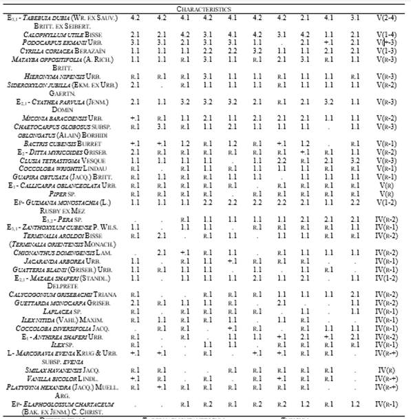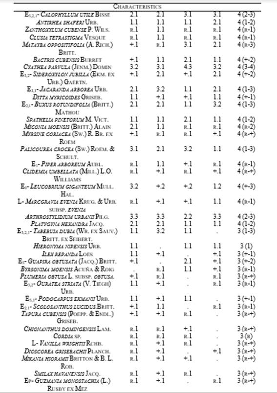 When compare the average number of species between the two studied associations in this paper and Pimento odiolentis-Calophylletum utilis [31], is observed that Terminalio aroldoi - Tabebuietum dubiae of Sierra del Cristal has the less average number of species with 50,1, while the biggest is present in the before mentioned [31] with 68,0, showing that in this kind of rainforest in Alturas de Moa and Cuchillas del Toa are floral more rich than Sierra del Cristal. Likewise behavior species number of the characteristic combination and the number of wooded species.