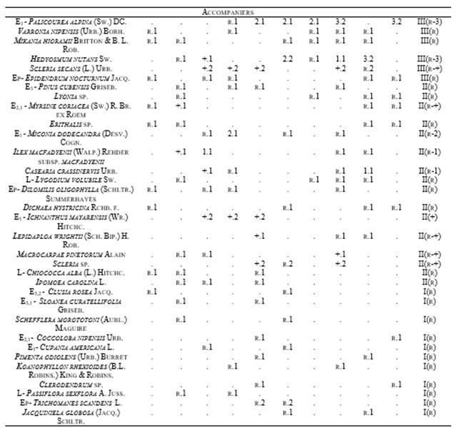 As epiphytal synucia Guzmania monostachia (L.) Rusby ex Mez (abundant) and Elaphoglossum chartaceum (Bak. ex Jenm.) C. Christ. are constants Marcgravia evenia Krug & Urb. subsp. and evenia as frequent.