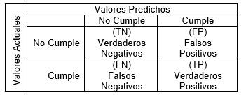 TP: Verdadero Positivo, valores que en la predicción fueron positivos o de la clase cumple y en los valores actuales también lo eran.
