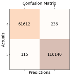Los resultados permiten identificar que el modelo que mejor realiza la predicción del resultado dentro de las pruebas de rendimiento es “Random Forest”, debido a que el valor de la métrica F1-Score fue de 0.99849, esta métrica tiene la capacidad de hacer buenas predicciones en los resultados de las pruebas de rendimiento, en este caso se priorizo por encima de la métrica “Accuracy”, ya que las clases de la base de datos no estaban balanceadas. La Figura 3 presenta la curva ROC / AUC, se puede apreciar que tiene un ajuste adecuado en la esquina superior izquierda. La Figura 4 presenta la matriz de confusión