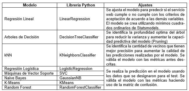 Cómo lo datos tienen rangos muy diversos en sus variables, se debe usar la normalización de datos por medio de MinMaxScaler de sklearn. Finalmente, para el entrenamiento del modelo, se agregará una columna de “cumplimiento” donde el resultado es 1 si cumple y 0 si no cumple. Los modelos fueron entrenados en una proporción de 75/25 (75% de los datos para entrenar, y 25% de los datos para test). Gracias a esto se puede observar la precisión que tienen los modelos. Todos los modelos se desarrollaron en Python haciendo uso de las herramientas: Google Colaboratory y el IDE - Spyder. Para conocer los parámetros ideales para cada uno de los modelos, se empleó la función GridSearchCV. La Tabla 1 presenta las librerías y los ajustes preliminares realizados a cada uno de los modelos: