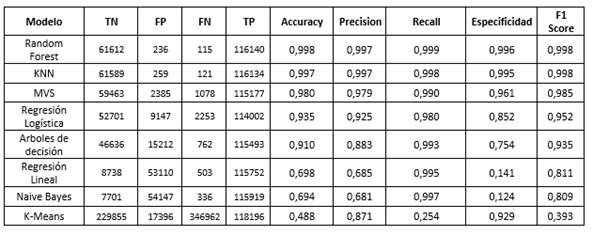 Otros modelos que tuvieron un buen desempeño fueron el k - Vecinos Próximos (K-NN) con una puntuación F1 de 0.99837 y el de máquinas de vectores de soporte (MVS) con un F1-Score de 0.98519. La Regresión logística también mostró una tasa menor que los modelos anteriormente mencionados para detectar los resultados que no cumplen con los criterios. Sin embargo, la precisión estuvo en 0.92572, lo que muestra que la capacidad para hacer predicciones positivas correctas es inferior que los modelos anteriores. Los modelos de Regresión Lineal y Naive Bayes fueron los modelos con menor capacidad para identificar los resultados que no cumplen con los criterios de aceptación, para estos dos modelos esta métrica fue inferior a 0.14, lo que los hace menos eficientes a la hora de hacer predicciones. Finalmente, el modelo menos eficiente de todos para predecir si los resultados cumplen o no con los criterios de aceptación fue el de K-Means.