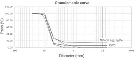 Through the granulometric analysis of the recycled coarse aggregate and the natural aggregate, the values of maximum natural size were obtained. The recycled aggregate presented a classification by size of 93.47% gravel, 0.57% corresponding to sand and 5.96% to fine material. On the other hand, Figure 2 shows the gran-ulometric curve obtained by the sieving analysis test carried out on these materials