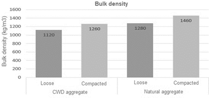 With respect to bulk density, it can be seen that there is not a considerable difference between the two materials. This is due to the crushing process used, since, in both cases, it was carried out in the same plant, generating a similarity in the shape and size of the grains. This allows the voids between particles to be simi-lar and the changes that occur are only governed by the internal porosity of each material.