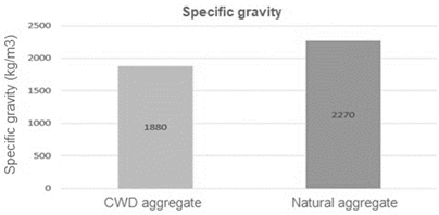 Figure 4 presents the specific gravity for coarse aggregates, in which the reduction of 17.2% is observed, reflecting the greater presence of pores in the recycled aggregate grains.