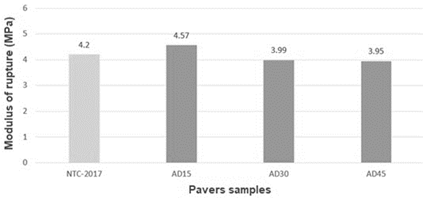 Figure 7 shows the results obtained for the modulus of rupture of the paving stones in saturated condition, which indicated that only the 15% substitution percentage managed to comply with the flexural-tensile strength required by the NTC 2017 standard.