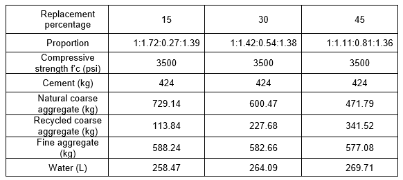 Table 1 shows that, by including CDW, the amount of coarse and fine aggregate is decreased, this is because the method used is based on the absolute volume of the materials. It can be noted that the density decreases as the implementation of CDW in the mix increases [15]. On the other hand, the amount of water increases as indicated by some studies carried out [16]-[18]. In these it was shown that the absorption and porosity that the recycled aggregate presents in its natural state, is the reason why the quantity must be in-creased to make the mixture.