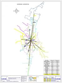 Con la aplicación de algoritmos de redes se determinaron los trazados de las micro rutas de aprovechamiento. Se realiza el modelado de 16 micro rutas, identificando 112 nodos que sirven como puntos de recolección para las organizaciones de recicladores de oficio. Con la aplicación del algoritmo de la ruta más corta se fija el trazado lineal de la micro ruta. Para esto se utilizaron centroides entre cada una de las micro rutas con dirección al punto de gravedad del plano de la ciudad para proseguir con el cálculo de las distancias mínimas.