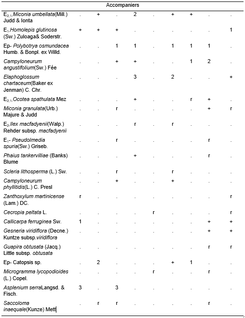 In addition.Inv. 1.Prunus myrtifolia (L.)Urb.r, Ichnanthus mayarensis (C. Wright) Hitchc. r, Paspalum conjugatum P.J. Bergius r, Marcgravia sp. r, Hohenbergia penduliflora (A. Rich.) Mez +, Phlebodium aureum (L.) J. Sm. r; Inv. 2. Tabebuiaangustata Britton r, Tillandsia flexuosa Sw. r; Inv. 3. Miconia elata (Sw.) DC. r, Pisonia aculeata L. r, Begoniasp. r, Coccocypselumsp. r, Smilaxsp. r; Inv. 4. Cyathea arborea (L.) Sm. +, Lithachne pauciflora (Sw.) P. Beauv. ex Poir. r, Canavalianitida (Cav.) Piper r, Smilax havanensis Jacq. r; Inv. 5. Cecropia peltata L. r, Myrciaria floribunda (Willd.) O. Berg r, Pavonia spinifex (L.) Cav. r, Paspalum conjugatum P.J. Bergius r, Mikania micrantha Kunth r; Inv. 6. Ilex macfadyenii (Walp.) Rehder subsp. macfadyeniir,Piper peltatum L. r, Eugenia sp. r, Scleriasp. r, Psychotria greeneanaUrb. r, Rapaneasp. r; Inv. 7. Citharexylum caudatum L. r,Scleria secans (L.) Urb. +, Mikania micrantha Kunth r, Ipomoea carolina L. r, Tillandsia fasciculata Sw. r; Inv. 8. Guettarda monocarpa Urb. +, Peperomia maculosa (L.) Hook. 1, Psychotria sp.+, Scleria lithosperma (L.) Sw. +, Coccocypselum herbaceum Aubl. r, Pseudolmedia spuria (Sw.) Griseb. r, Ipomoea carolina L. r, Isochilus linearis (Jacq.) R. Br. +, Hillia parasitica Jacq. r, Aechmea nudicaulis (L.) Griseb. r, Dichaea hystricina Rchb. f. +, Leucobrium giganteum Mull. Hal. +, Pyrrhobryum spiniformeHedw.) Mitt. +, Thuidium delicatulum(Hedw.) A.Schimp. in B.S.G.+, Blechnum fragile (Liebm.) C. V. Morton & Lellinger r, Thelypteris deltoidea(Sw.) Proctor 2; Inv. 9. Casearia sylvestris Sw. subsp.sylvestris r, Cecropia peltata L. 1, Hieronyma clusioides (Tul.) Griseb. 1, Clusia rosea Jacq. +, Ilex nitida (Vahl) Maxim. r, Miconia elata (Sw.) DC. r, Pipersp. r, Danaea nodosa (L.) Sm. +, Olyra latifolia L. 1, Oplismenus hirtellus (L.) P. Beauv. subsp. hirtellus 2, Alsophila balanocarpa(D. C. Eaton) D. S. Conant1, Sloanea curatellifolia Griseb. r, Campiloneurum sp. +.