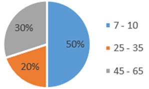 Como primera medida se presenta en la Figura 10 el rango de edades de los usuarios que han hecho uso de las aplicaciones móviles. Se observa que las edades oscilan entre 7 años y 10 años con un 50%, edades entre 25 años y 35 años con un 20% y finalmente edades entre 45 años y 65 años con un 30%.