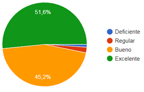 Por otra parte, en cuanto a la manera como califican el contenido expuesto respecto a claridad, coherencia y conceptos en la app, el 51,6% consideran que es excelente, mientras que el 45,2% la consideran buenas. Ver Figura 13.