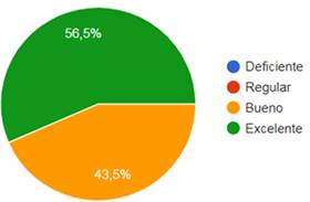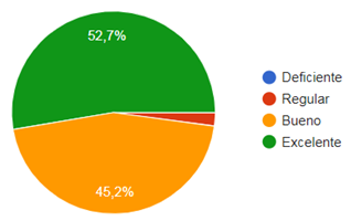 En otro aspecto importante, se indagó a los usuarios en relación a cómo califica la app al dar respuesta a sus necesidades, en este caso en el proceso de enseñanza aprendizaje. Observando la Figura 14 se pueden encontrar que el 52,7% de los encuestados la considera excelente, mientras que el 45,2% la consideran buena.