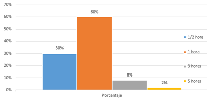 Un aspecto importante tiene que ver con el tiempo empleado por los usuarios en relación al desarrollo de actividades, como se observa en la Figura 17, en donde de manera significativa se evidencia que con el uso de dispositivos móviles se presentan tiempos cortos para poder lograr finalizarlas. Se encuentra que el 60% de los usuarios indican que las actividades se realizaron en un tiempo de 1 hora, mientras que 30% responden que el tiempo es de media hora, es decir que las aplicaciones móviles aportan significativamente al desarrollo del trabajo individual, permitiendo que cada estudiante marque su propio ritmo durante el estudio de una temática.