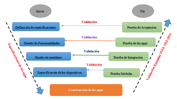 Para el desarrollo del presente trabajo, se consideraron dos aspectos principales: el componente tecnológico y el desempeño cualitativo de las aplicaciones móviles construidas, en cuanto a su aspecto tecnológico, se aborda la metodología de desarrollo de sistemas embebidos planteada por [19][20], en pro de poder lograr una integración de los respectivos protocolos y sistemas eficientes de comunicación, que permitan conectar los dispositivos móviles con sus periféricos. Para el caso particular aquí tratado, se asume como sistema embebido a una aplicación de propósito específico, alojada en un procesador o en un dispositivo programable [21], que gestiona datos generados por sensores, realiza acciones de control sobre actuadores o transmite información en forma remota [22]. Para el desarrollo del software se utilizó la metodología ágil Scrum [23], realizando debidamente las actividades establecidas en ella: Reunión diaria del equipo de trabajo, planificación de sprints, revisión de sprints para la realimentación del producto. Para la integración del hardware con el software, se tomó como referencia la metodología de modelo en V, el cual es un procedimiento uniforme para el desarrollo de productos TIC y el perfeccionamiento de software embebido [23]. El proceso de validación de las aplicaciones, se orientó bajo los parámetros establecidos por el estándar IEEE 1012-2016, el cual instaura el procedimiento para realizar la verificación y validación de sistemas, software y hardware [24], en la Figura 1 se puede ver la descripción de la metodología.