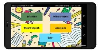 Esta aplicación maneja un menú principal con funcionalidades fáciles de entender para el usuario, como se observa en la Figura 3[JEGP1] , se disponen de 5 opciones como son Escritura, Friend Student, Steam English, Acerca de y Salir, donde solo basta con hacer click en la opción deseada y se podrá explorar por todo su contenido.