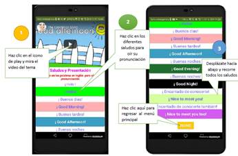 Una de las herramientas presentes en SAIA v1.0 tiene que ver con los Greetings, aquí el estudiante puede aprender sobre los saludos empleados durante un dialogo regular de una conversación en inglés, las opciones y botones de navegación se detallan a continuación en la Figura 5. Algo que se destaca de esta aplicación es que si giras el Smartphone la pantalla cambiará su posición a horizontal o vertical, según sea el caso y tu preferencia de visualización.