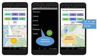 Dentro de sus funcionalidades, GRobot carga el mapa de Colombia junto a sus 6 regiones geográficas, ésta permite que el usuario ubique el departamento respectivo dentro de la región geográfica, una vez ubicado puede ampliar el mapa, girarlo y recorrerlo como desee. GRobot lo orienta a través de comandos de voz y narra información relevante sobre cada departamento. La interfaz que se despliega se muestra en la Figura 7.