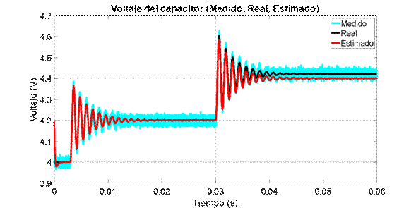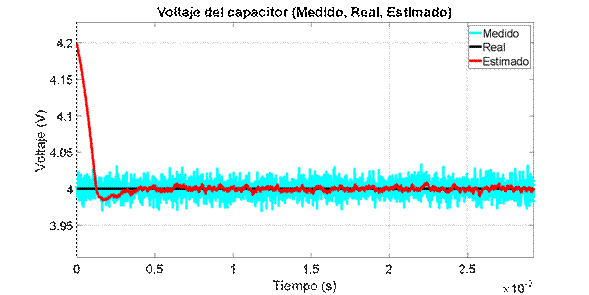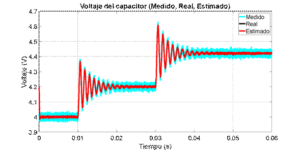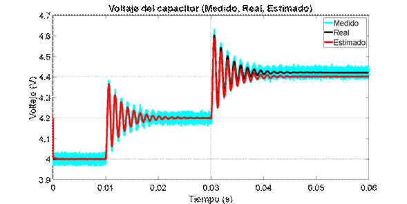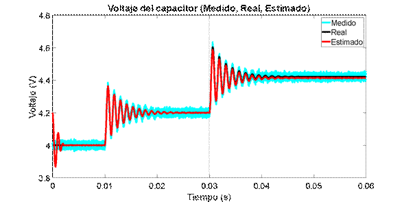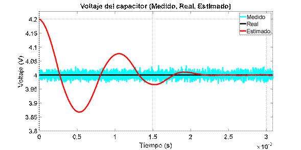 son las matrices en el espacio de estado discreto del modelo lineal, y Q y R son las matrices que contienen las varianzas del ruido del proceso y de medición respectivamente y E es el operador esperanza matemática. En este caso Q=diag(0.001^2) y R=0.01^2 debido a que se quiere evaluar la capacidad del estimador para filtrar el ruido del sistema. Las variables denotadas con el superíndice (–) corresponden a variables a priori, mientras que las que están denotadas con superíndice (+) son variables a posteriori. El tiempo de discretización es de 1𝜇𝑠, de forma que sea lo suficientemente menor a la constante de tiempo del sistema, 𝜏=3𝑚𝑠, impuesta por los polos, y así tener una correcta representación del sistema discreto.
