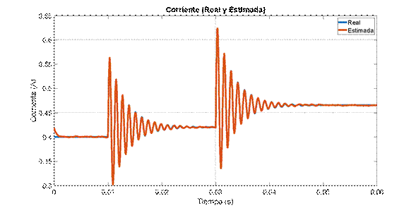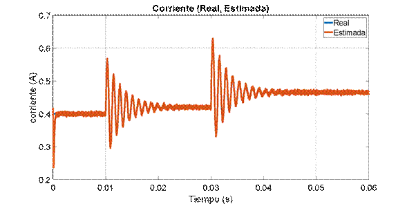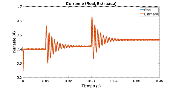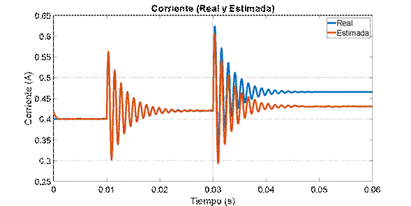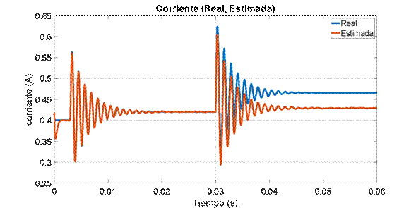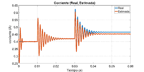 Al observar la variable medida en la Figura 8, se puede apreciar la robustez del estimador ante el ruido, el cual se logra filtrar exitosamente. Adicionalmente se puede ver como el estado estimado sigue adecuadamente el medido. Sin embargo, al realizar una perturbación en la entrada D en 0.03 s, el estimador presenta un pequeño error de estado estacionario debido a que está trabajando lejos del punto de operación. Finalmente se realiza la estimación de la corriente a partir de la medición del voltaje. En la Figura 9 se observa que el estimador de corriente funciona adecuadamente, y al igual que en el caso anterior, hay un error en estado estacionario luego de 0.045 s.