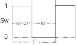 . Esta relación es conocida como ciclo de trabajo y T es el periodo de conmutación, es decir, el tiempo total en el que se realiza el proceso de apertura y cierre del interruptor. Para aclarar esto, en la Figura 3 se muestra la variable