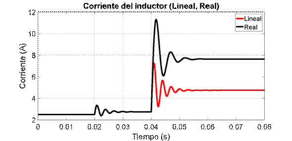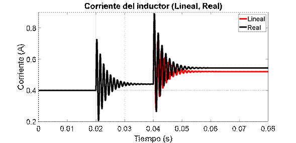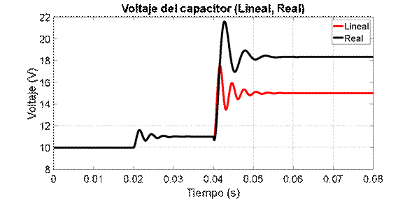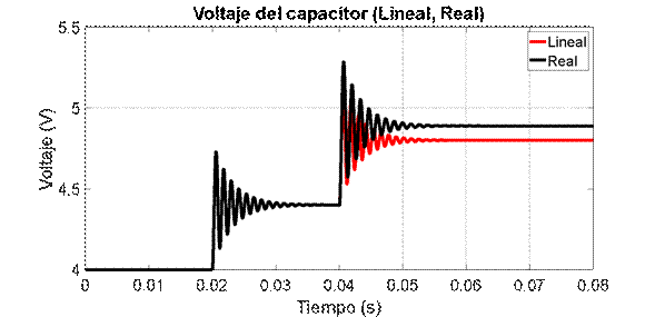 Estas ganancias dependen de las condiciones de operación, es decir del voltaje en el condensador y de la corriente por la bobina, esto hará que el modelo lineal tenga problemas de estado estacionario ante esta entrada, lo cual se evidenció también en las Figuras 4a, 4b, 5a y 5b.