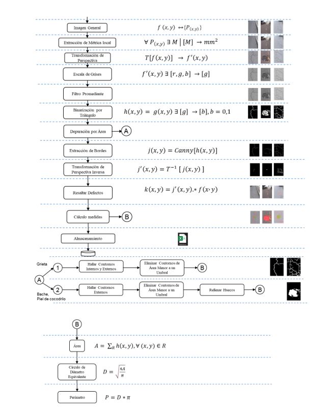 Tello-Cifuentes et. al [3], proponen un algoritmo para clasificación y evaluación de irregularidades sobre pavimentos (equivalentes a las tratadas en este trabajo) usando técnicas de fotogrametría y redes neuronales. En primer lugar, se capturan las imágenes de alta resolución y como segunda etapa se aplican técnicas de preprocesamiento a las imágenes, tales como: corrección geométrica, mejora de contraste y compensación en cambios de iluminación, aplicación de la transformada Beamlet para la detección de líneas y curvas, y aplicación de operaciones morfológicas, como tercer paso, se aplica una etapa de extracción de características que consiste en calcular los momentos invariantes de la imagen del punto anterior. Finalmente, con estos descriptores se da paso a la implementación de un algoritmo de clasificación tipo perceptrón multicapa (MLP). Para la etapa de evaluación de nivel de deterioro se halla el porcentaje de área afectada y de acuerdo con este se clasifica en deterioro ligero, medio o alto. En la etapa de clasificación se obtuvo un porcentaje del 96% (accuracy), del 96.97% (precision), del 93.33% (recall) y un índice Kappa de 0.936.