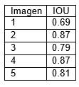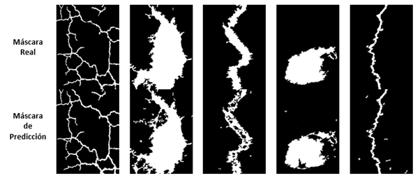 Para evaluar el desempeño de la metodología propuesta se realizó la captura de 5 imágenes de pavimento que contienen los tres tipos de deterioro analizados a lo largo de este trabajo: grietas, baches y piel de cocodrilo. A estas imágenes se les extrajo de manera manual una máscara binaria que resalta el área de afectación y que posteriormente se compararon con las máscaras binarias de predicción arrojadas por el algoritmo. Dicha comparación se realizó con la métrica de intersección sobre unión explicada anteriormente. Los resultados por cada imagen se muestran en la tabla a continuación y, además, se deja una imagen con el comparativo entre la máscara de predicción y la máscara real o etiquetada (Figura 5):