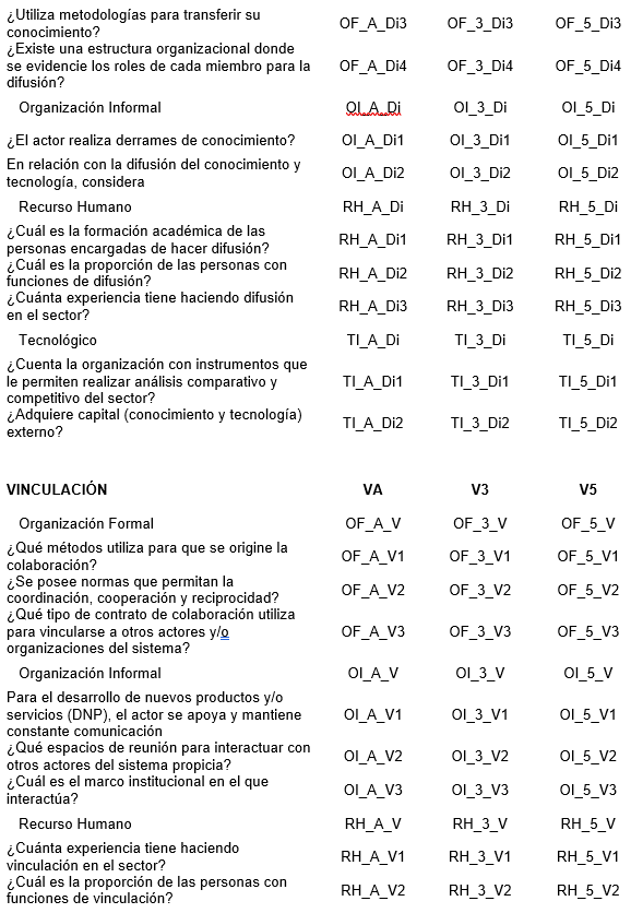 Fase III: Construcción del modelo de medición y evaluación de las CIT. Para entender y analizar los procesos y sus relaciones, las clústeres se abordan como Sistemas de Innovación de carácter sectorial localizados, donde el funcionamiento de la red de las organizaciones de la cadena dependen de las interacciones para importar, modificar y difundir nuevas tecnologías ofrecidas por los actores desde sus diferentes funciones como lo son la generación, difusión y uso del conocimiento, las cuales son fundamentales para que se den los procesos de acumulación de las CIT y aprendizaje tecnológico [44]. Las CIT son definidas como la habilidad que posee un actor para hacer uso de los recursos con el fin de realizar alguna actividad [45], sin embargo, la comprensión de estas relaciones o interacciones no son fáciles de analizar a causa de la heterogeneidad de los actores que componen un SRIA.