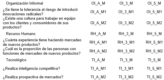 Estas variables fueron evaluadas dentro de una línea de tiempo para medir su evolución durante los periodos: actual, hace tres años y hace 5 años; de manera que se incluyen inicialmente 195 variables, más los indicadores resultantes del ejercicio de calcular el grado de madurez de las capacidades de las empresas con base en la escala definida por Lall [12] en la misma línea de tiempo.