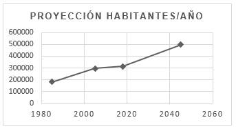 Teniendo en cuenta la información numérica de la población de Neiva, se proyectó la población con el método geométrico (Ecuación 2) al año 2045, el cual se estima una población de 495,817 para este año. Esto indica que, para la proyección de 26 años, la población seguirá teniendo un incremento exponencial, generando la necesidad de plantear metodologías estratégicas para conservar el espacio público y un estado óptimo de las condiciones ambientales; esta estimación revela el crecimiento demográfico que tendrá la zona urbana de Neiva, y evidencia la necesidad de identificar áreas adecuadas para la expansión urbana.