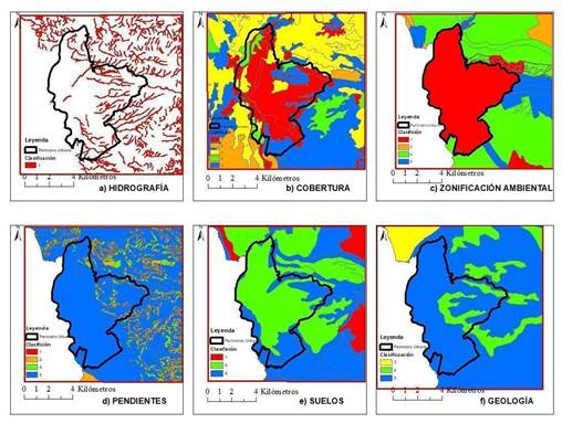 Siguiendo las notas de aptitud (ver Anexo 2), se realizó una reclasificación de los mapas temáticos los cuales se presentan en la Figura 5 y se basa en los aspectos ambientales que se relacionan con los componentes de hidrografía, coberturas vegetales y geomorfología. Estos criterios determinan el desarrollo basado en un sistema ambientalmente sostenible.