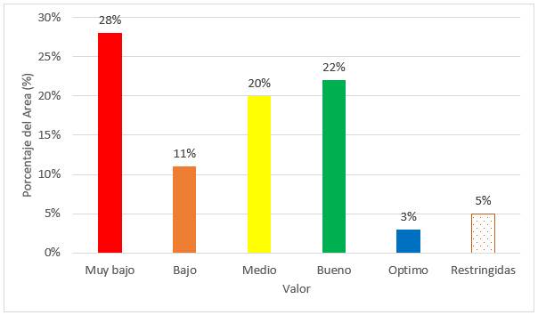 Al realizar un procesamiento de imágenes, se pudo determinar el porcentaje de ocupación de cada una de las zonas determinadas por medio de la metodología expuesta en este trabajo. El conteo de píxeles permitió determinar el porcentaje de ocupación de cada zona (ver Figura 7). Dichos porcentajes permitieron calcular el área total estimada de cada sector.